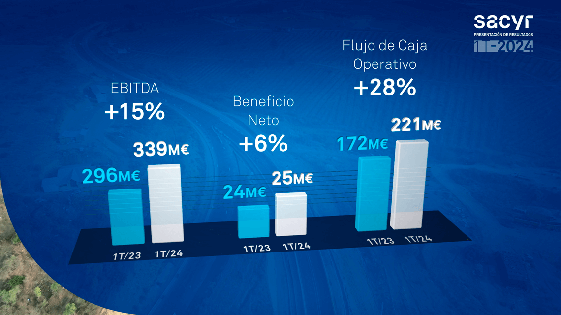 Sacyr obtuvo en el primer trimestre de 2024 un EBITDA de 339 millones de euros, el 15% más que en el mismo periodo del año anterior, y un flujo de caja operativo de 221 millones de euros (+28%).