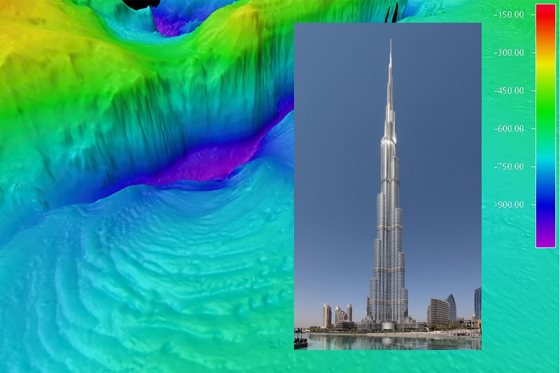 Uno de sus hallazgos más llamativos es un monte submarino previamente desconocido frente a la costa de California de aproximadamente 1.000 metros (unos 3.200 pies) de altura. Este monte es, por lo tanto, más alto que el rascacielos más alto del mundo: el Burj Khalifa, situado en Dubai. Con más de 828 metros de altura y 160 plantas, este edificio ostenta varios récords mundiales. Además de ser el edificio más alto del planeta, cuenta con la plataforma de observación al aire libre más alta del mundo y los ascensores con mayor distancia de recorrido del mundo.