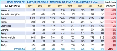 No está nada mal esta sangría en la montaña de Riaño: Acebedo, Burón, Crémenes y Maraña han sido literalmente arrasadas…, perdiendo el parque la mitad de su población. No parece que la declaración de este parque regional haya supuesto una oportunidad socioeconómica: si lo hubiera sido, no se hubiera marchado la mitad de su población.