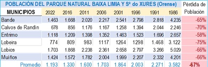 Veamos por último un Parque Natural en Galicia, provincia de Orense, donde la despoblación ha resultado demoledora. Hablamos del P.N. “Baixa Limia y Sª do Xures, donde se declararon hasta 30.000 hectáreas protegidas, una extensión notoria teniendo en cuenta que el tipo de propiedad dominante es la de régimen privado. La sangría demográfica alcanza el 67% de la población respecto del inicio del periodo: