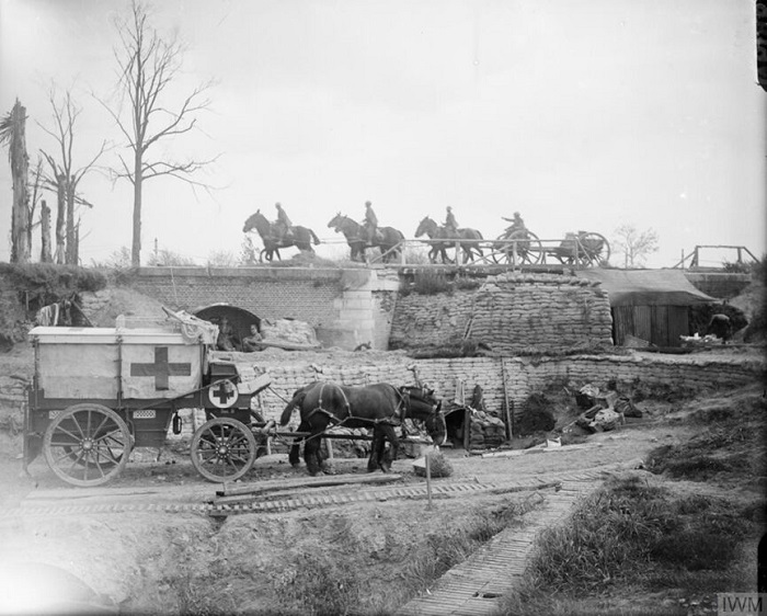 Una ambulancia tirada por caballos en el frente occidental durante la Primera Guerra Mundial. Crédito: Museo Imperial de la Guerra.
