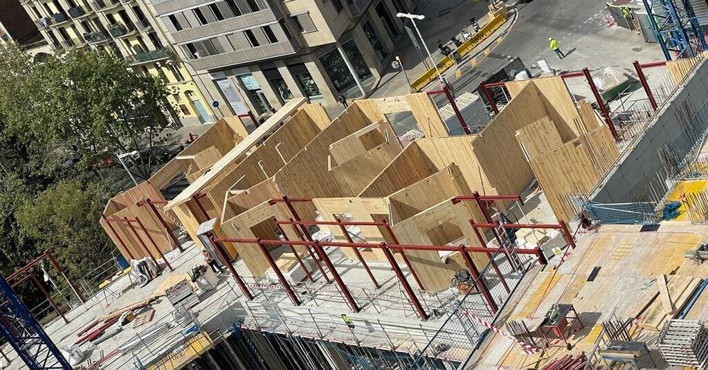 “Esta no es la primera vez que construimos un edificio de madera en Barcelona. En 2017 participamos en la transformación de la nave de almacenamiento de hilos, de la antigua fábrica Fabra & Coats, en un complejo de vivienda social, con 46 viviendas sociales, llamada Can Fabra”, explica Javier Astasio, jefe de obra del edificio de madera, llamado Illa Glories de Barcelona.