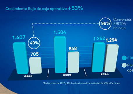 La compañía logró en 2024 un porcentaje de conversión de EBITDA en caja del 96% frente al 56% de 2023. Esto significa que, en 2024, de los 1.352 millones de EBITDA, 1.294 millones se transformaron en flujo de caja.