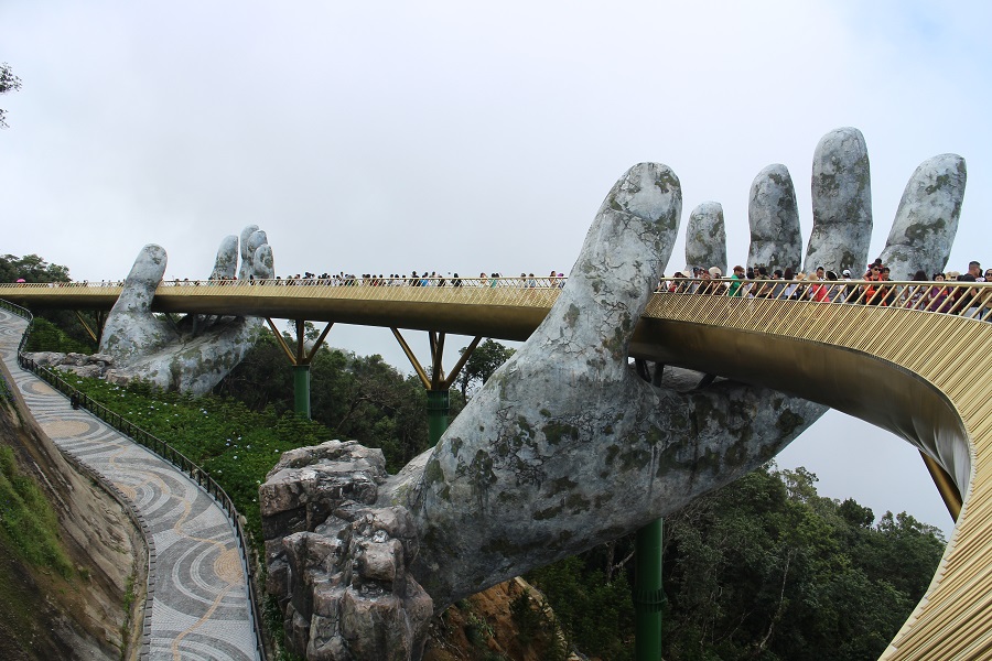 In the hills of Vietnam, other giant concrete hands cradle a 152-metre-long pedestrian bridge suspended almost 1,400 metres above sea level. The bridge is known as Cau Vang (Golden Bridge) and was designed to make visitors feel like they are taking a stroll on a shimmering thread stretched across the hands of God.